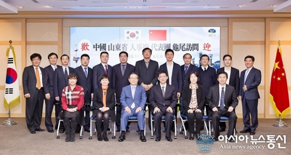 18일 경북 구미시를 방문한 중국 산동성 인사청 리 지옌 쉰(李建勛) 부처장을 단장으로 한 산동성 및 산하 12개 시 인사담당 간부공무원이 남유진 구미시장과 기념사진을 찍고 있다.(사진제공=구미시청)