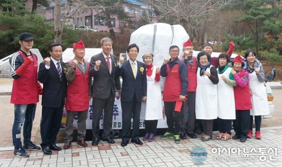 고윤환 경북 문경시장과 이응천 문경시의회 의장이 절임배추를 수출하는 로컬푸드협동조합원들과 기념사진을 찍고 있다.(사진제공=문경시청)