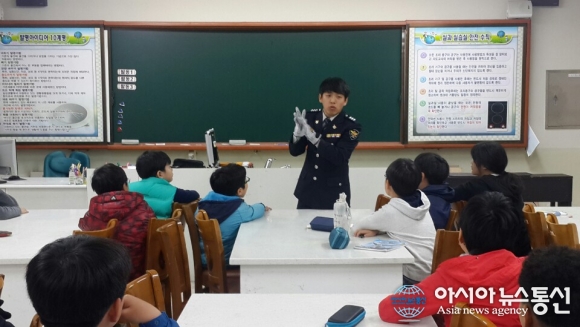 18일 인천연수경찰서 여성청소년과가 신송초등학교를 방문해 찾아가는 경찰진로체험 교실을 진행하고 있다.(사진제공=인천연수경찰서)
