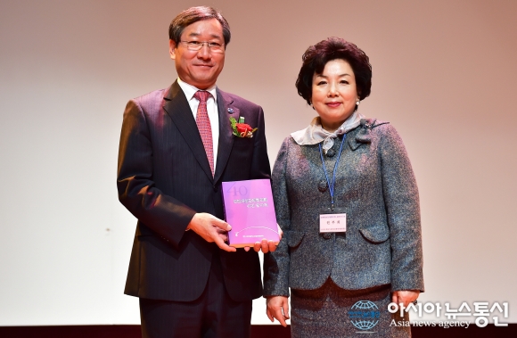 19일 유정복 인천시장(왼쪽)이 신세계백화점 문화홀에서 열린 인천여성단체협의회 40주년 기념식에서 인천여성단체협의회 40년 발자취 책을 원부희 인천여성단체협의회장(오른쪽)으로 부터 전달받고 기념촬영을 하고 있다.(사진제공=인천..