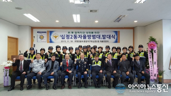 18일 인천부평경찰서가 동암지구대 십정2동 자율방범대 발대식을 개최하고 기념촬영을 하고 있다.(사진제공=인천부평경찰서)