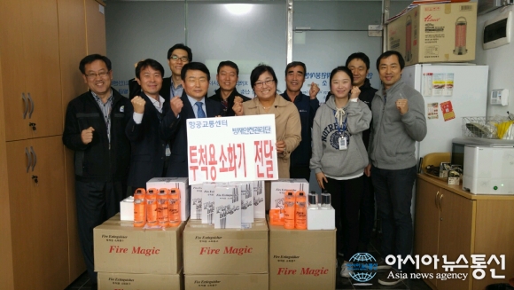 지난 17일 인천중구자원봉사센터는 항공교통센터 방재안전관리단에서 영종지역 요양원·어린이집·유치원 등 15개 기관에 투척용 소화기 120개를 후원했다고 밝혔다. 사진은 기념촬영을 하고 있는 모습.(사진제공=인천중구청)