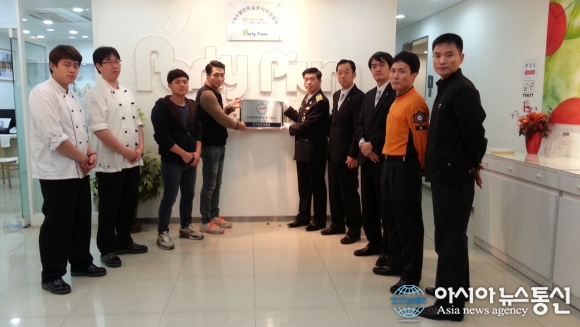 19일 인천공단소방서가 연수구 송도동에 소재한 파티피움을 관내 다중이용업소 안전관리 우수업소로 선정하고 소방안전관리 우수업소 현판식을 진행하고 있다.(사진제공=인천공단소방서)