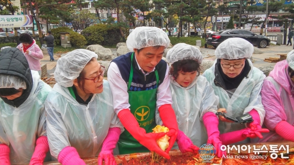 19일 인천남구새마을회가 주관하고 인천남구새마을부녀회가 주최한 사랑의 김장 나누기 행사가 옛 시민회관 쉼터 공원에서 진행되고 있다. 사진은 박우섭 인천남구청장(왼쪽에서 세번째)이 김장김치를 담그고 있는 모습.(사진제공=인천남..