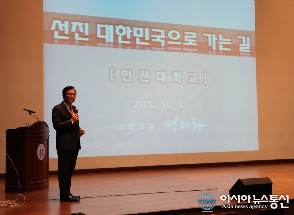 지난 17일 인천대학교 동아시아평화경제연구원 남북경협 인천아카데미가 송도캠퍼스 대강당에서 정의화 국회의장을 초청, 선진 대한민국으로 가는 길이라는 주제를 가지고 특강을 진행하고 있다.(사진제공=인천대학교)