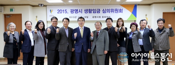 19일 경기 광명시는 시청 중회의실에서 생활임금위원회 위촉식과 생활임금 심의회를 열어 시간당 생활임금을 6600원부터 구간별 적용하는 것으로 결정하고 양기대 시장과 기념사진을 촬영했다.(사진제공=광명시청)