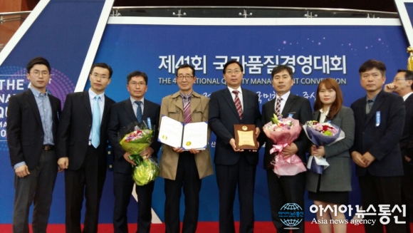 18일 인천환경공단이 산업통상자원부와 국가기술표준원이 주최하고 한국표준협회가 주관한 제41회 국가품질경영대회에서 품질분임조 경진대회 대통령상 수상 및 2015 품질경쟁력 우수기업으로 3년 연속으로 선정됐다. 사진은 수상 후 기념..