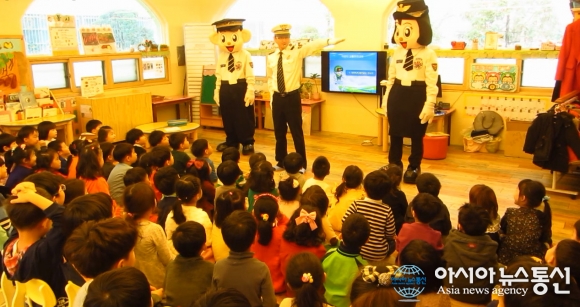 19일 대전둔산경찰서는 대전 서구 월평동 다모아유치원에서 어린이 120명을 대상으로 교통경찰과 포돌이·포순이가 직접 교통안전교육은 물론 모형횡단보도를 이용해 직접 건너보는 체험도 병행했다.(사진제공= 둔산경찰서)
