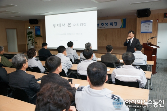 19일 대전유성경찰서는 유성서 5층 대회의실에서 조용연 전 충남지방경찰청장의 특별강연을 실시했다.(사진제공=대전유성경찰서)