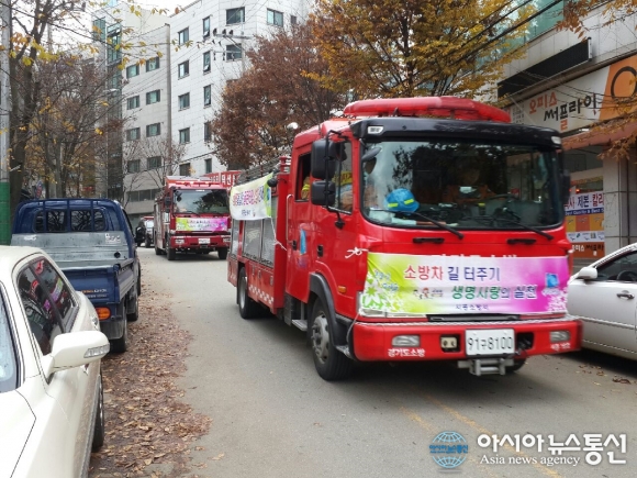 19일 경기 시흥소방서는 시흥소방서에서 수자원공사까지 소방통로확보 홍보를 위한 소방차 퍼레이드를 펼쳤다.(사진제공=시흥소방서)
