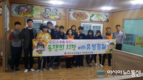 18일 대전유성경찰서 학교전담경찰관과 학교 밖 청소년들이 청소년영화제에 참석한 후 기념촬영을 취하고 있다.(사진제공=대전유성경찰서)