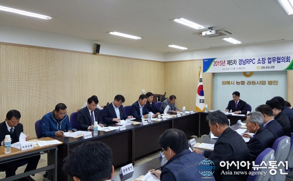18일 경남 김해시농협조합공동사업법인 회의실에서 경남농협과 경남 미곡종합처리장 소장협의회가 마련한 ‘2015 제5차 경남RPC 소장 업무협의회’가 열리고 있다.(사진제공=경남농협)
