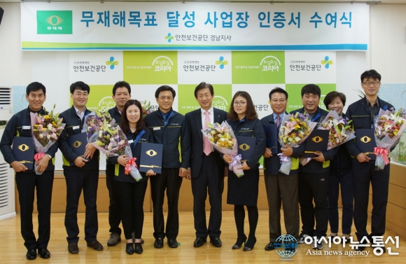19일 오전 한국산업안전보건공단 경남지사(지사장 최병남)에서 창원시설공단 관계자들이 ‘무재해 사업장 인증서’를 받은 후 기념촬영을 하고 있다.(사진제공=창원시설공단)