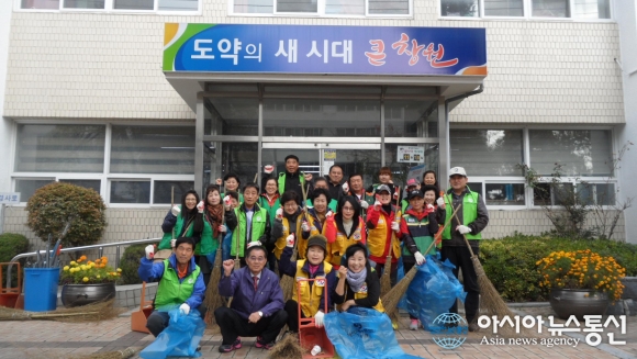 19일 경남 창원시 진해구 중앙동 직원과 단체원이 시가지 대청소 후 파이팅을 하며 사진촬영.(사진제공=창원시청)