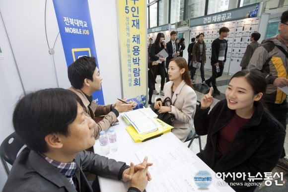 19일 전북대학교 진수당에서 열린 '2015 우수기업 채용박람회'에서 취업준비생들이 기업 관계자와 상담하고 있다.(사진제공=전북대학교)