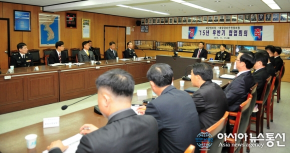 17일 해군 정비창 부대 회의실에서 서춘택 해군 정비창장 등이 참석한 가운데 해경정비창과의 후반기 협업회의가 열리고 있다.(사진제공=해군 정비창)