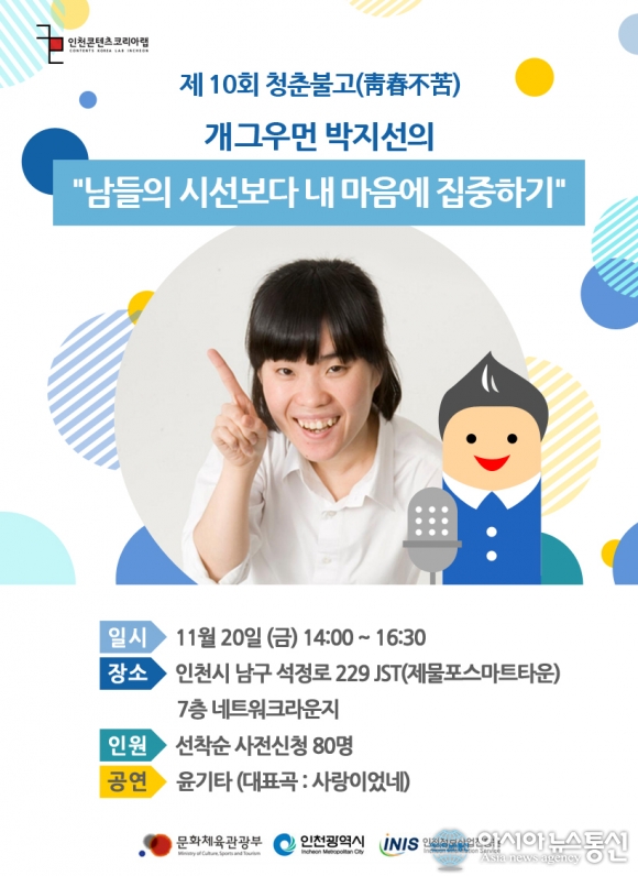 20일 문화체육관광부와 인천시가 주관하고 인천정보산업진흥원에서 주최하는 인천콘텐츠코리아랩이 청춘불고(청춘의 진로찾기) 강연콘서트가 제물포스마트타운(JST) 7층 네트워크라운지에서 열린다. 사진은 강연 포스터 이미지.(사진제공..