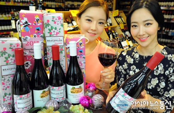 19일 서울 홈플러스 영등포점에서 모델들이 2015년 보졸레누보를 선보이고 있다.(사진제공=홈플러스)