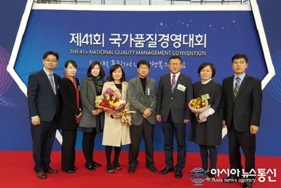 지난 18일 서울 삼성동 코엑스에서 열린 제41회 국가품질경영대회 시상식에서 철도시설공단은 6년 연속 대통령상을 수상했다. 사진은 시상식에 참여한 송창헌 차장(왼쪽), 심아영 과장, 김지연 사원, 노춘선 대리, 임찬규 부장, 김순일 부..