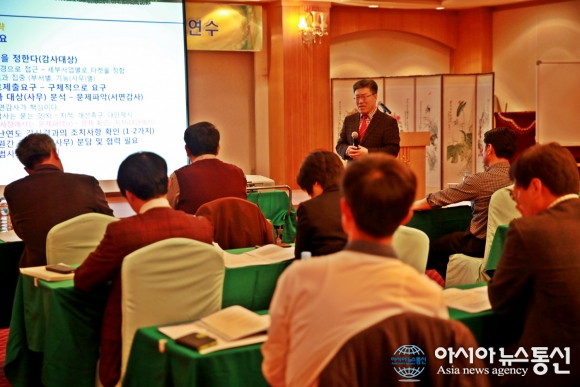 17일 경북 울진군 북면 소재 덕구호텔에서 있은 '울진군의회 특별연수'에서 한국산업기술원 김대희 교수가 행정사무감사 기법을 제시하고 있다.(사진제공=울진군의회)