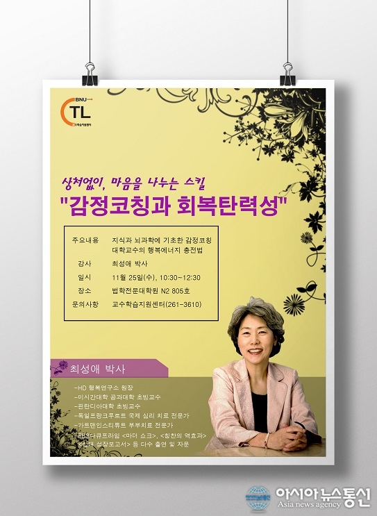 오는 25일 충북대학교에서 진행되는 최성애 박사 초청 ‘감정코칭과 회복탄력성’ 특별 강연 포스터.(자료제공=충북대학교)
