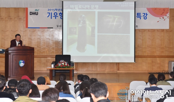 18일 오후 대구한의대학교 바이오센터 강당에서 재학생 200여명이 참석한 가운데 학교법인 제한학원 기우항 이사장이 '도형관찰의 흐름'이란 주제로 특강을 하고 있다.(사진제공=대구한의대학교)