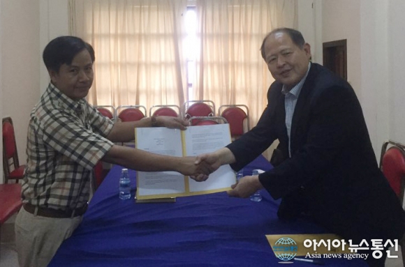18일 캄보디아 시엠레아프지역 앙코르대학교에서 이근용 대구대 대외협력부총장(오른쪽)과 디아노린 앙코르대학교 부총장이 협약 체결 후 기념사진을 찍고 있다.(사진제공=대구대)