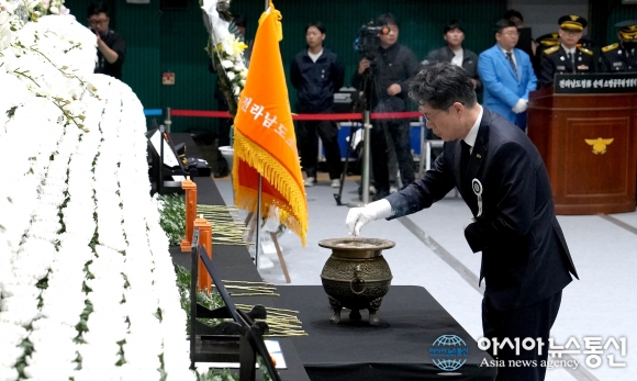 [아통포토] 완도 수산물 가공공장 화재 순직 소방관에게 헌화하는 황기연 ..