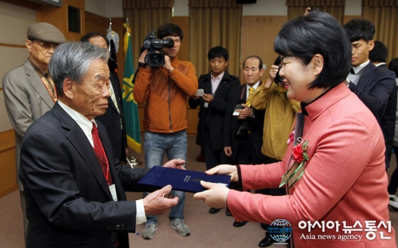 대전 노인사회활동 활성화 대회 포상하는 백춘희 정무부시장