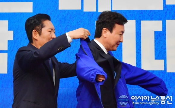 [아통포토] 전태진 변호사에게 민주당 점퍼 입혀 주는 정청래 민주당 대표