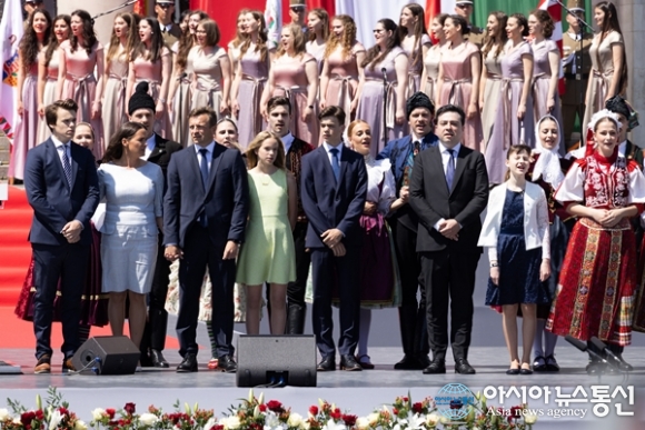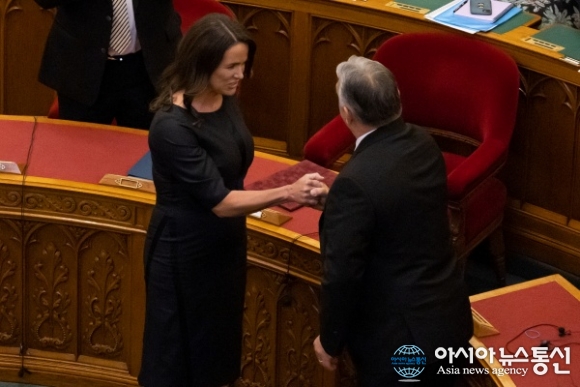 [아통포토] 헝가리 대통령이 가족과 배우들과 취임식에서 노래