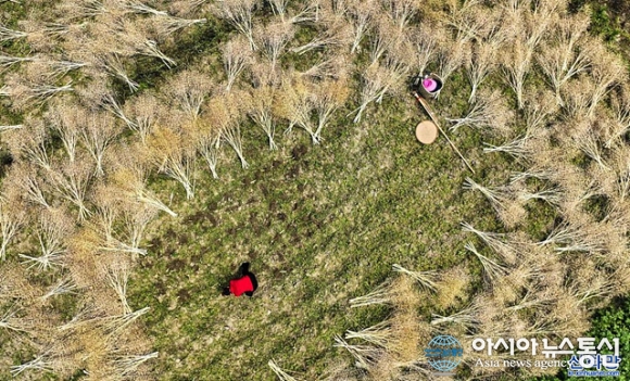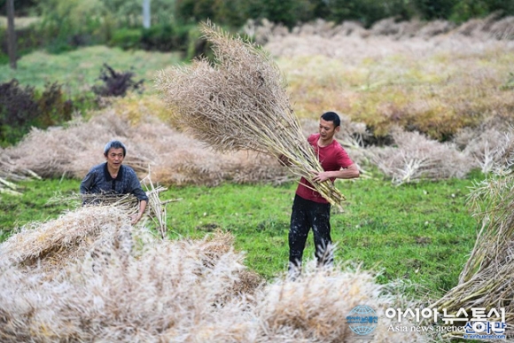 유채씨를 수확하는 마을 주민들