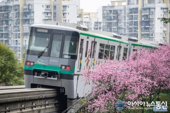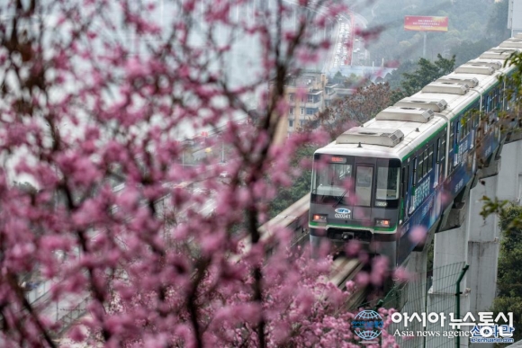 中 충칭에 찾아온 봄…봄꽃 사이를 누비는 열차