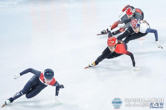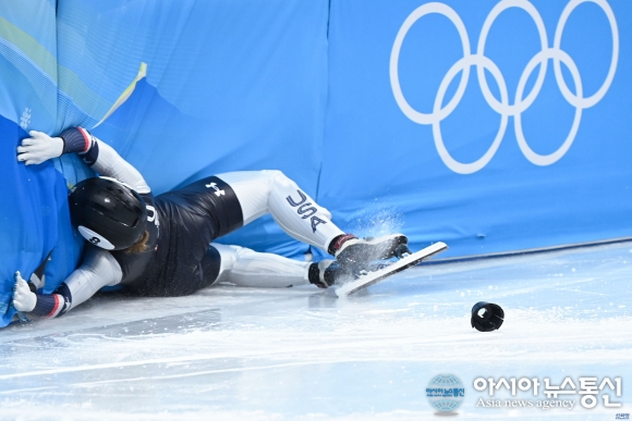 [아통포토] 쇼트트랙 여자 3천m 계주 경기에서 넘어진 미국 선수