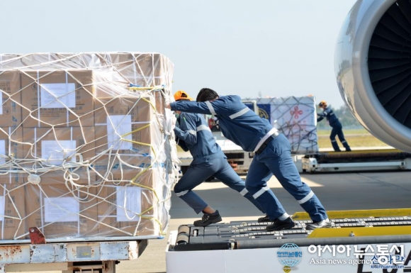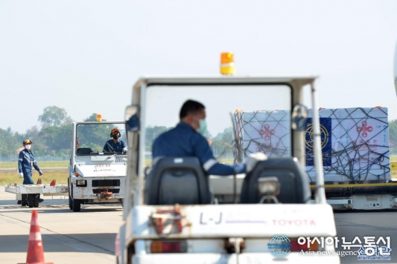 비엔티안 공항에 도착한 코로나19 백신 추가분