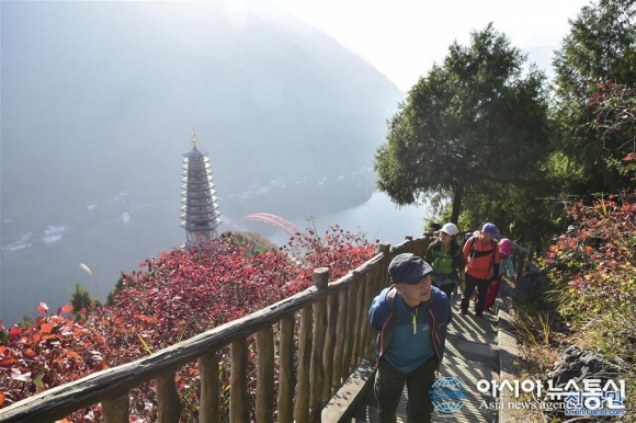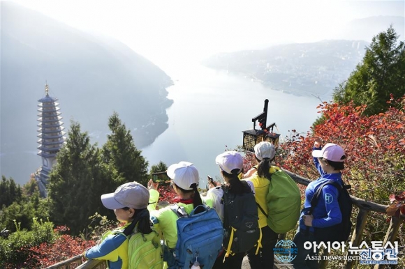 충칭 우산 단풍객 '북적북적'