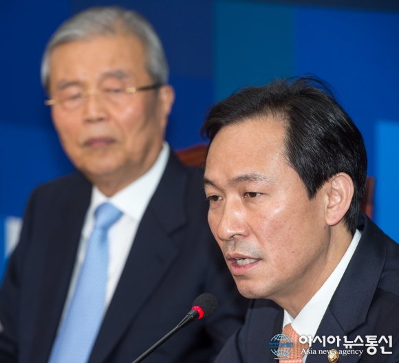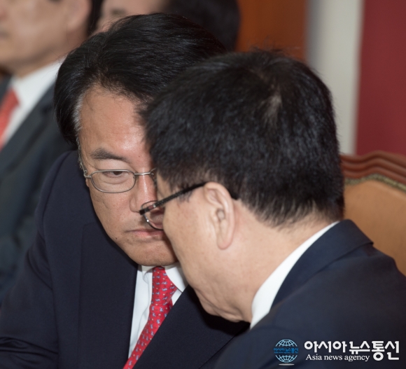 한 위원과 이야기 하는 정진석 새누리 원내대표