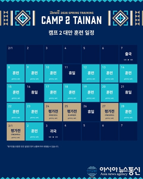 (사진제공=NC 다이노스) [아시아뉴스통신=이상진 기자] NC 다이노스 C팀(퓨처스팀)이 오는 7일 대만 타이난으로 출국한다. C팀은 지난 1월 25일부터 마산야구장에서 진행해온 CAMP 2 일정을 대만 타이난으로 확장해 이어간다. 7일 인천국제공항을 통해 출국하는 선수단은 3월 3일까지 24박 25일... 2026-02-04