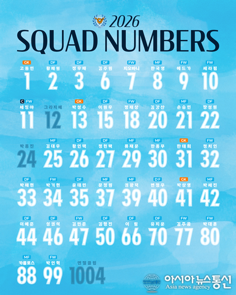 (사진제공=대구FC) [아시아뉴스통신=이상진 기자] 대구FC가 2026시즌 선수단 등번호를 공개했다. 지난 시즌 대구의 중심을 이뤘던 선수단 다수는 기존 번호를 유지하며 변함없는 각오를 다졌다. 세징야(11번), 에드가(9번), 김강산(20번), 황재원(2번), 한태희(31번) 등은 익숙한 번호와 함께 다... 2026-02-04