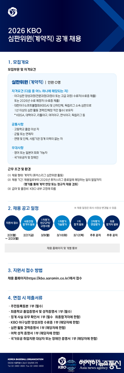 (사진제공=KBO) [아시아뉴스통신=이상진 기자] KBO는 퓨처스리그에서 활동할 KBO 심판위원을 공개 채용한다. 이번 채용은 KBO 야구심판 양성과정 수료자(2026년 야구심판 양성과정 수료 예정자 포함) 또는 대한야구소프트볼협회(KBSA) 및 산하단체, 독립리그 소속 심판으로 1년 이상의 심판 활... 2026-02-03