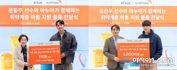 (사진제공=아누아) [아시아뉴스통신=이상진 기자] 글로벌 브랜드 빌더 기업 더파운더즈(각자대표 이선형, 이창주)가 전개하는 글로벌 뷰티 브랜드 아누아(ANUA)가 선케어 라인 모델인 문동주(한화 이글스), 오선우(KIA 타이거즈) 선수와 함께 취약계층 아동을 위한 1억5000만 원 상당의 물품 기... 2026-04-14
