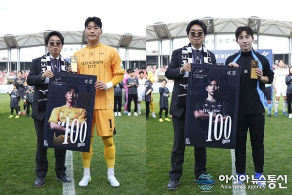 (사진제공=성남FC)) [아시아뉴스통신=이상진 기자] 성남FC의 주축 박상혁과 이광연이 홈팬들의 뜨거운 박수 속에 K리그 통산 100경기 출전 기념행사를 가졌다. 성남FC는 지난 12일 탄천종합운동장에서 열린 '하나은행 K리그2 2026' 7라운드 안산그리너스와의 홈경기 시작에 앞서 박상혁... 2026-04-14