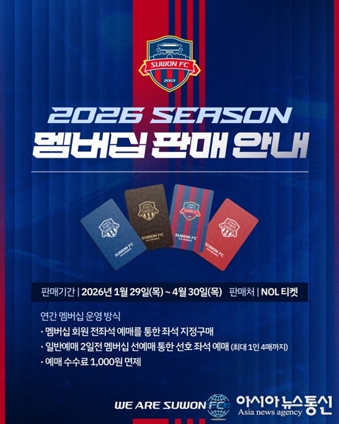 (사진제공=수원FC) [아시아뉴스통신=이상진 기자] 수원FC가 29일 오후 2시부터 2026시즌 연간(유료) 멤버십 판매를 시작한다. 이번 연간 멤버십은 4월 30일까지 판매되며, 가입 즉시 2026시즌 수원FC 마지막 홈경기까지 혜택을 누릴 수 있다. 2026 수원FC 연간 멤버십은 프리미엄석, 레드존(W석),... 2026-01-29
