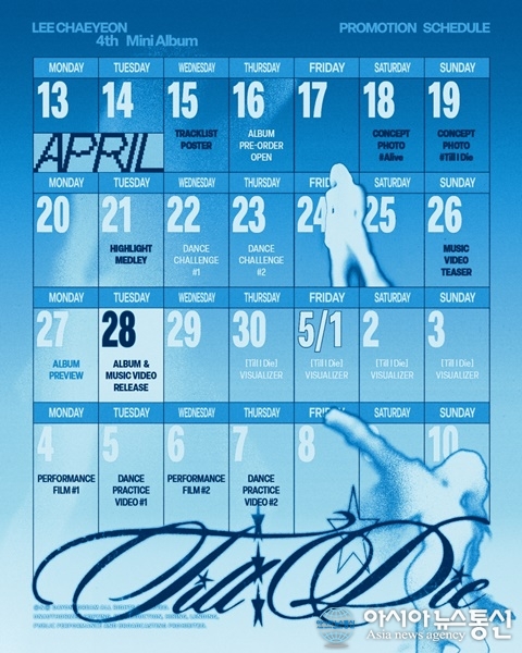 (사진제공=데이원드림) [아시아뉴스통신=이상진 기자] 가수 이채연이 본격적인 컴백 카운트다운에 돌입하며 컴백 열기에 불을 지폈다. 소속사 데이원드림(DayOneDream)은 14일 오후 6시 공식 SNS 채널을 통해 이채연의 미니 4집 'Till I Die(틸 아이 다이)' 프로모션 캘린더를 게재했다. 공... 2026-04-15