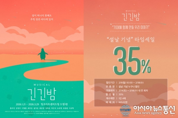 (사진제공=㈜라이브러리컴퍼니) [아시아뉴스통신=이상진 기자] 뮤지컬 '긴긴밤'이 설 연휴를 맞아 가족 관객을 위한 특별 할인 프로모션을 진행한다. 긴 연휴 동안 온 가족이 함께 즐길 수 있는 공연을 찾는 관객들에게 '긴긴밤'은 따뜻한 메시지와 이야기로 의미있는 시간을 선... 2026-02-09