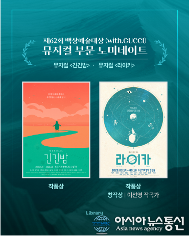 (사진제공=㈜라이브러리컴퍼니) [아시아뉴스통신=이상진 기자] 글로벌 라이브 콘텐츠 기업 라이브러리컴퍼니가 제작한 뮤지컬 '긴긴밤'과 '라이카'가 제62회 백상예술대상(With Gucci) 신설 뮤지컬 부문 ‘작품상’ 후보에 나란히 올랐다. 특히 '라이카'는 뮤지컬 부... 2026-04-14