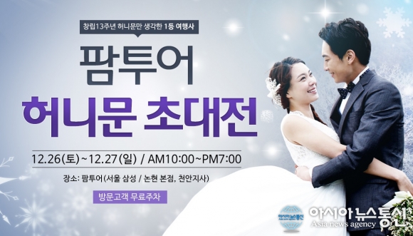 자료사진.(사진제공=팜투어) 대한민국 1등 허니문여행사 팜투어(대표이사 권일호)는 오는 26일(토요일)과 27일(일요일) 이틀 동안 2015년 연말을 맞아 올 한해 동안 예비 신혼부부들의 높은 호응을 얻은 팜투어 허니문초대전 결산 특별 할인 이벤트를 개최한... 2015-12-21