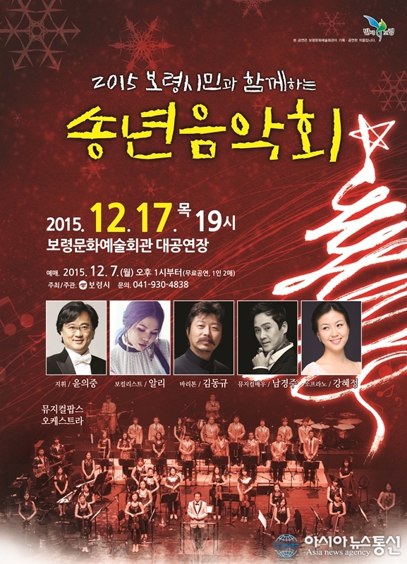 사진은 2015 송년음악회 포스터.(사진제공= 보령시청) 보령시민과 함께하는 2015 송년음악회가 오는 17일 오후 7시 보령문화예술회관 대 공연장에서 개최된다. 시민들의 문화예술에 대한 다양한 욕구충족을 위해 보령시가 마련한 이번 송년음악회는 한... 2015-12-03