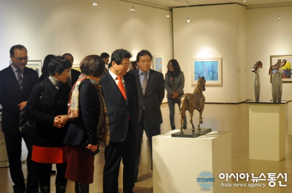 2일 안상수 경남 창원시장이 창원문화재단 성산아트홀 제1전시실에서 열린 ‘2015 향토작가 컬렉션’ 개막식에 참석, 전시된 작품들을 감상하고 있다.(사진제공=창원문화재단) ‘2015 향토작가 컬렉션’ 개막식이 2일 오후 6시30분 경남 창원... 2015-12-03