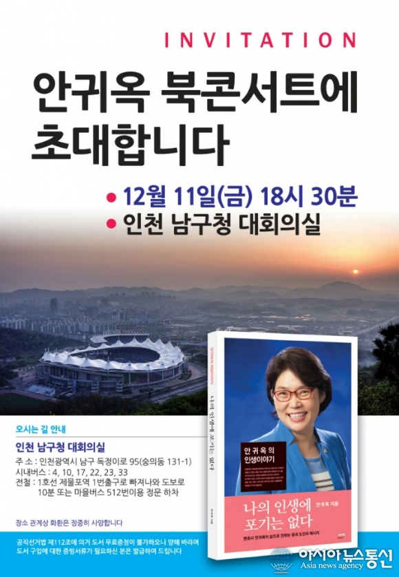 오는 11일 오후 6시30분 인천 남구청 대회의실에서 열리는 안귀옥 변호사의 북콘서트를 알리는 포스터 사진 모습./아시아뉴스통신=김태일 기자 새정치민주연합 남구을 지역위원장인 안귀옥 변호사가 북 콘서트를 개최한다. 오는 11일 열리는 안귀옥... 2015-12-02